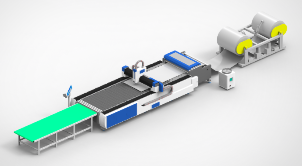 激光切割自動旋轉機床(俗稱;全自動卷料光纖激光切割機廠家,提供旋轉平臺光纖激光切割機,全自動卷料送料激光切割機,卷料激光切割生產線 滾動臺面光纖激光切割機,自動上料激光切割機,風管激光切割機自動上料下料,通風管道風管激光切割生產線,風管激光開料機,通風管道光纖激光下料機,卷材全自動激光切割機送料設備):包括卷料料架,校平裝置,激光機床床體、接料平臺,自動刀條旋轉組件;工作原理:首次入料卷料通過校平機校平后進入激光切割平臺進行切割,切割完成后校平機自動送料,旋轉平臺自動把切割完成的配件輸送到接料平臺,校平機送料完成后系統運行切割第二張排版圖料件,同時可進行切好料件的編號收集工作,以此往復工作大大提高整體加工速度及效率。